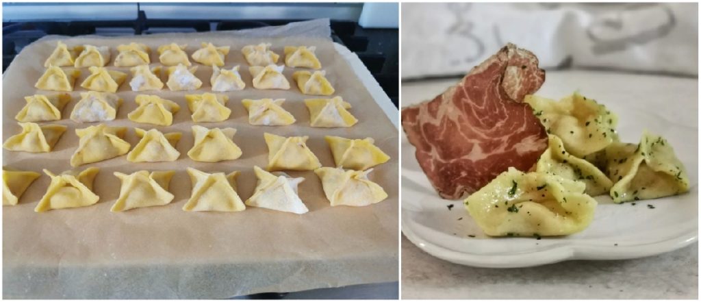 La farce des raviolis est à base de coppa piacentina AOP hachée, ricotta, grana padano râpé et épices, qui se combinent pour créer un mélange de saveurs harmonieux et équilibré. La préparation des raviolis est assez simple, mais nécessite un peu de dextérité pour la fermeture en étoile des pâtes. Vous pouvez sinon opter pour une fermeture classique. Naturellement, la farce est enveloppée dans un écrin de pâtes fraîches à l’œuf, qui rend ce plat raffiné et particulièrement savoureux.