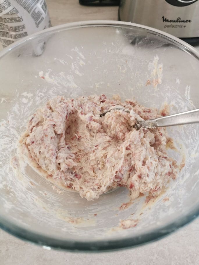 Préparation de la farce. Prenons les tranches de coppa et mettons-les dans un hachoir, elles doivent finir en minuscules morceaux. Mélangeons la coppa hachée avec la ricotta, ajoutons le fromage râpé, le jaune d’œuf et les arômes, sans exagérer.