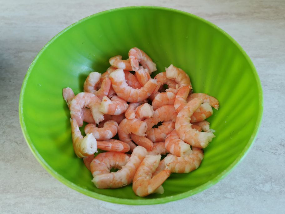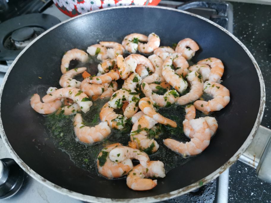 Récupérons les crevettes, séchez-les, mettons-les dans une poêle avec un filet d’huile, ajoutons quelques herbes comme du persil, couvrons avec un couvercle et laissons cuire environ 15 minutes.