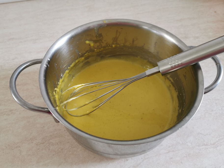 Dans une petite casserole, mélangez l’œuf et les jaunes, 1 cuillère à soupe de parmigiano, poivre, sel et l’amidon de maïs et commencez à battre avec le fouet à main, ajoutez la réduction précédemment filtrée. Transférez la petite casserole sur un bain-marie et continuez à mélanger, lorsque la sauce apparaîtra crémeuse, retirez-la du bain-marie et battez encore pendant quelques minutes.