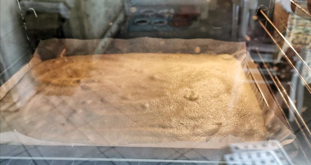 Verçons la pâte obtenue dans un moule rectangulaire (40×30) recouvert de papier sulfurisé, égalisons avec une spatule. Cuissons au four statique préchauffé à 180° pendant environ 20 minutes. Ventilé à 180° pendant 10 minutes. Une fois cuit, couvrez le biscuit avec une autre feuille de papier sulfurisé humide et essorée et enroulez-le délicatement sur lui-même.