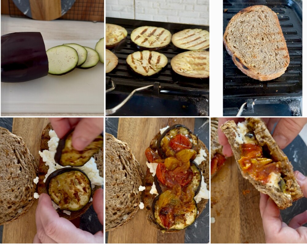 Garnis le sandwich: Ouvre les pains en deux, grille-les. Étale la stracciatella sur la base, puis ajoute les tranches d’aubergines grillées, les tomates confites légèrement écrasées et les feuilles de basilic frais.