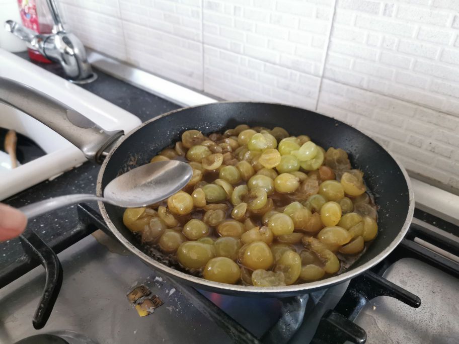 • Commençons par la grappe de raisin, nous la lavons, nous prenons les grains, nous les coupons en deux et enlevons les pépins. Dans un plat, nous mettons le beurre avec le sucre de canne et nous le faisons fondre à feu modéré. Nous ajoutons le raisin et le vin et nous faisons flétrir les grains