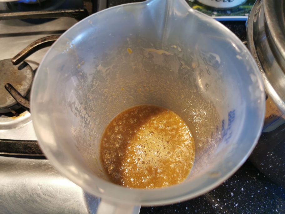 • Nous retirons du feu, transférons le mélange dans un verre et mixons le tout avec un mixeur plongeant
