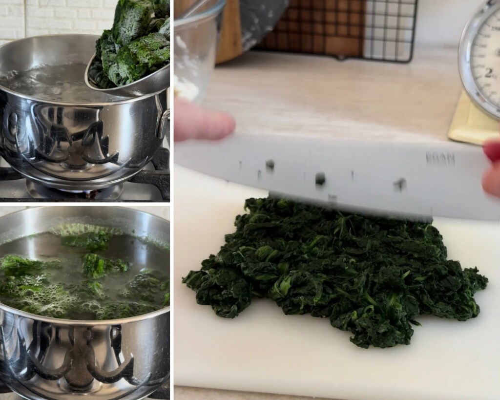 Prépare les épinards : Lave les épinards frais et fais-les cuire dans peu d’eau salée pendant quelques minutes, jusqu’à ce qu’ils flétrissent. Égoutte-les, presse-les très bien pour éliminer l’excès d’eau (c’est fondamental !) et hache-les grossièrement avec un couteau. Si tu utilises des épinards surgelés, fais-les cuire selon les instructions, égoutte-les et presse-les bien. Pendant ce temps, fais cuire les pâtes selon les instructions du paquet.