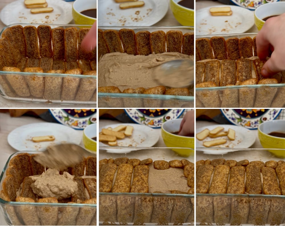 Alternez les couches : Versez la moitié de la crème au café sur les Pavesini, en nivelant bien. Créez une autre couche de Pavesini imbibés puis recouvrez avec le reste de crème. Fermez le dessert avec les Pavesini restants.