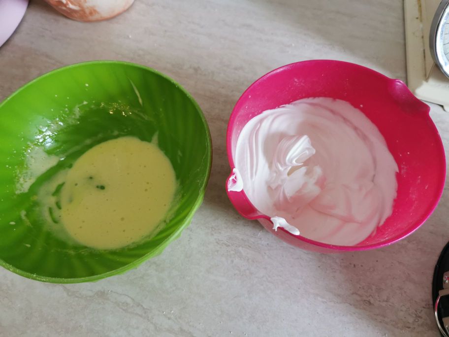 Montez le blanc d’œuf en neige avec 40g de sucre. Dans un autre bol, montez le jaune d’œuf avec le sucre restant. Trempez la gélatine dans l’eau froide, pressez-la bien, et faites-la fondre dans 3 cuillères à soupe de lait chaud