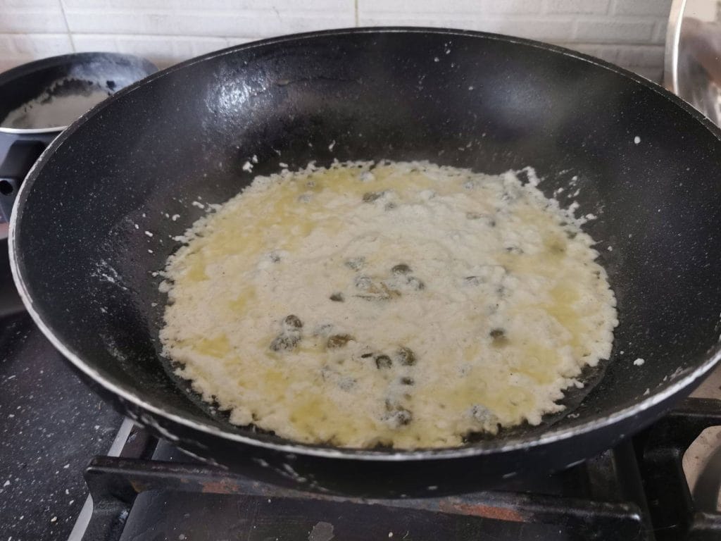 Commençons par cuire les pâtes dans de l’eau bouillante salée. Émiettons la moitié de la ricotta dans une poêle, avec 3 cuillères à soupe d’huile, du poivre, et une louche d’eau de cuisson des pâtes. Ajoutons 2 cuillères à soupe de câpres égouttées et le zeste râpé d’un citron.