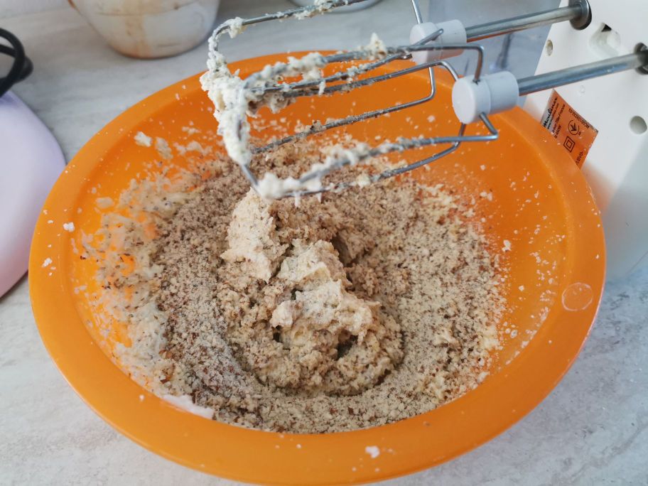 Préparons la crème frangipane. Battez le beurre avec le sucre à l’aide d’un fouet électrique, jusqu’à ce que le mélange soit doux et mousseux. Ajoutez les œufs un par un, en mélangeant et en alternant avec les amandes préalablement moulues, presque comme une farine.