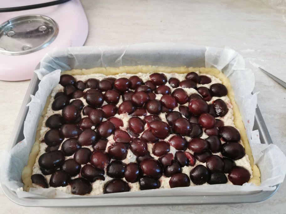 Dénoyautez les cerises et placez-les sur la crème, recouvrez le gâteau. Faites cuire dans la partie basse du four à 180° pendant environ 40 minutes. Laissez refroidir avant de servir