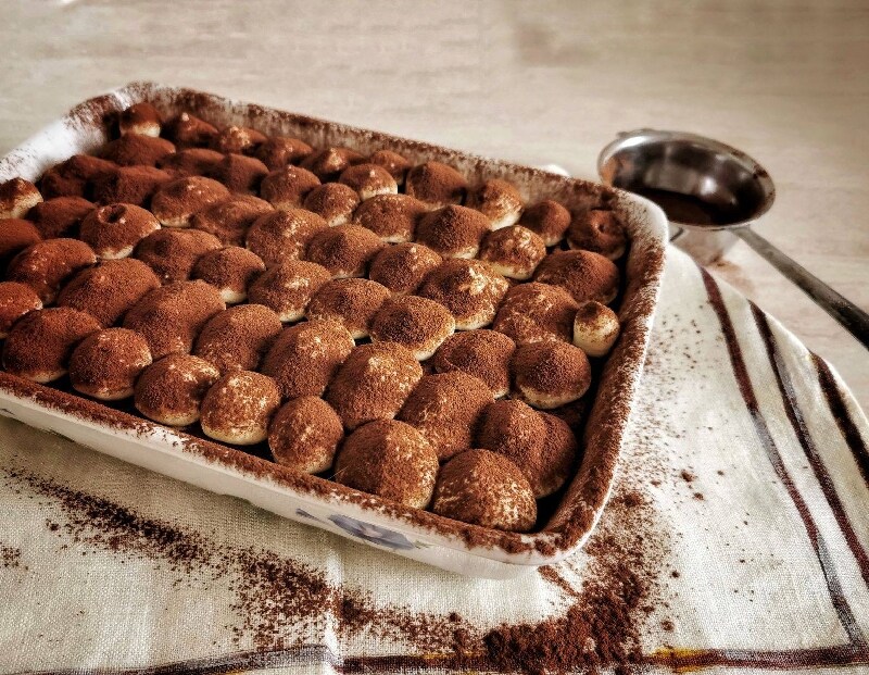 TIRAMISU’ CLASSIQUE, le dessert de la cuisine italienne, le plus aimé et célèbre dans le monde. Il se réalise sans cuisson, avec des biscuits à la cuillère imbibés dans le café, alternés en couches, avec de la crème au mascarpone, puis recouvert de cacao amer, enfin mis au réfrigérateur pour reposer, avant d’être servi froid. Une rare délice dont l’origine est incertaine et disputée, entre le Piémont, le Frioul, la Toscane et la Vénétie. Ci-dessous je vous dévoilerai tous les secrets pour obtenir une crème d’une consistance compacte, non liquide, et d’un goût délicat. De toute façon, il existe de nombreuses versions différentes de cette recette traditionnelle, avec de nombreuses variantes, celle que je vous laisse aujourd’hui est la recette du tiramisu que préparait ma famille aussi loin que je me souvienne. La préparation est simple, mais il faut utiliser de petites astuces indispensables pour obtenir un dessert parfait : les produits doivent être tous de très bonne qualité et frais du réfrigérateur. Ici, comme vous pouvez le voir sur la photo, il a été réalisé dans un seul plat, mais vous pouvez préparer facilement de petites portions individuelles, dans des cocottes, des verres, des assiettes. Le Tiramisu est parfait comme dessert de fin de repas pour toutes les saisons et diverses occasions…Noël, dimanches en famille, occasions spéciales…pratiquement toujours…..