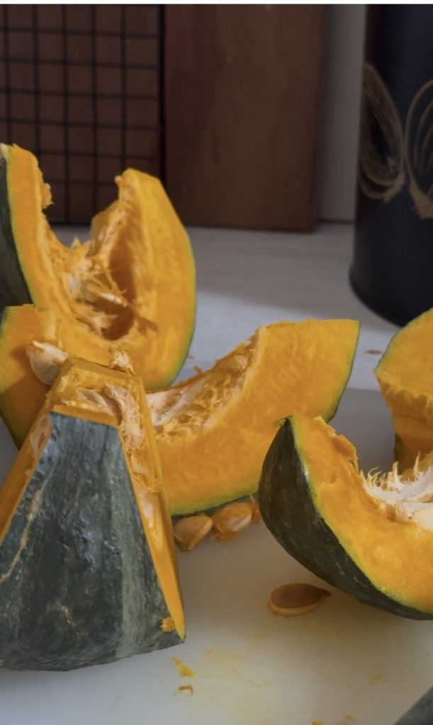 Commençons par la courge: Coupez la courge en tranches avec la peau, disposez-les sur une plaque recouverte de papier sulfurisé et faites cuire au four à 180° pendant environ 30 minutes. Elle doit être tendre.