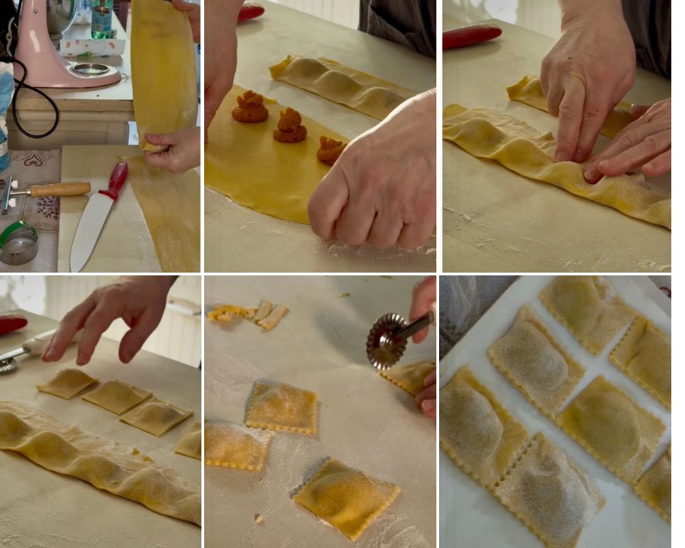 Préparons la farce: Écrasez la courge à l’aide d’un presse-purée pour obtenir toute la purée sèche. Si vous utilisez une courge jaune, elle est plus aqueuse et vous devrez la presser avec un torchon. Mettez dans un bol et ajoutez les amaretti émiettés, le fromage, la moutarde hachée, la noix de muscade et le sel. Mélangez bien, et ajoutez l’œuf, la quantité variant selon la douceur de la pâte, qui ne doit pas être trop molle, mais crémeuse. Mettez de côté et laissez reposer au moins 15 minutes. (La recette originale prévoit que la farce soit conservée au réfrigérateur pendant au moins 12 heures, afin qu’elle s’amalgame bien, si vous avez le temps, vous pouvez la préparer la veille)