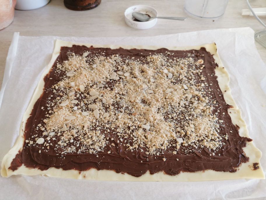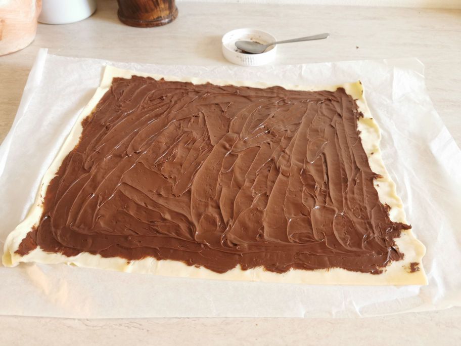 Prenons une pâte feuilletée rectangulaire, étalons-la bien, sur son papier sulfurisé. Mettons la nutella et l’étalons avec une cuillère, en laissant un bord de 1 cm tout autour
