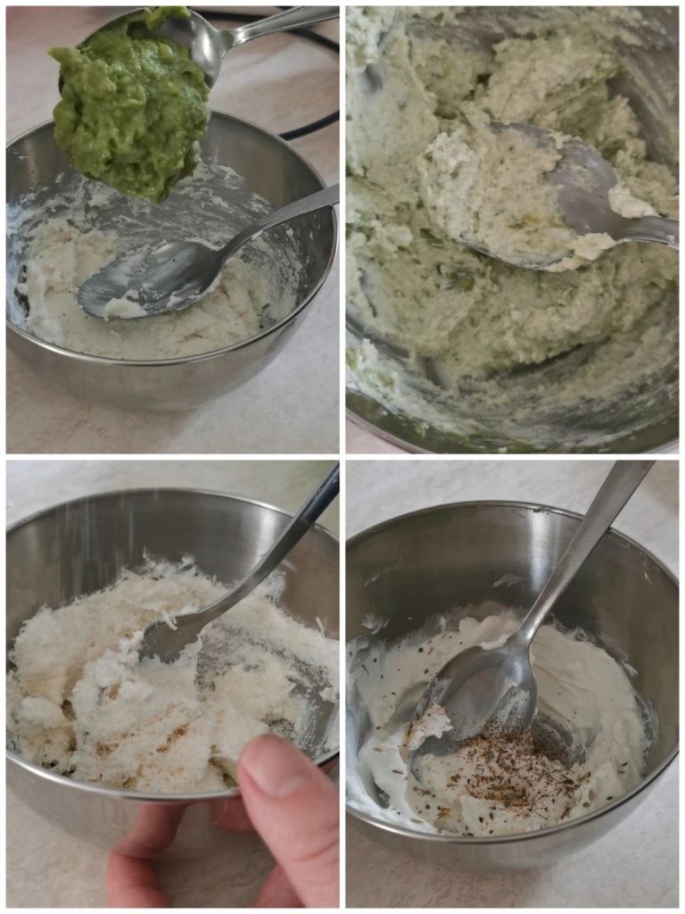 Dans un bol, mettons la ricotta, mélangeons-la pour la rendre douce, ajoutons les épices, la ciboulette hachée, le grana râpé, et enfin la crème de fèves. Mélangez bien le tout, couvrez d’un film alimentaire et mettez au réfrigérateur pendant quelques heures
