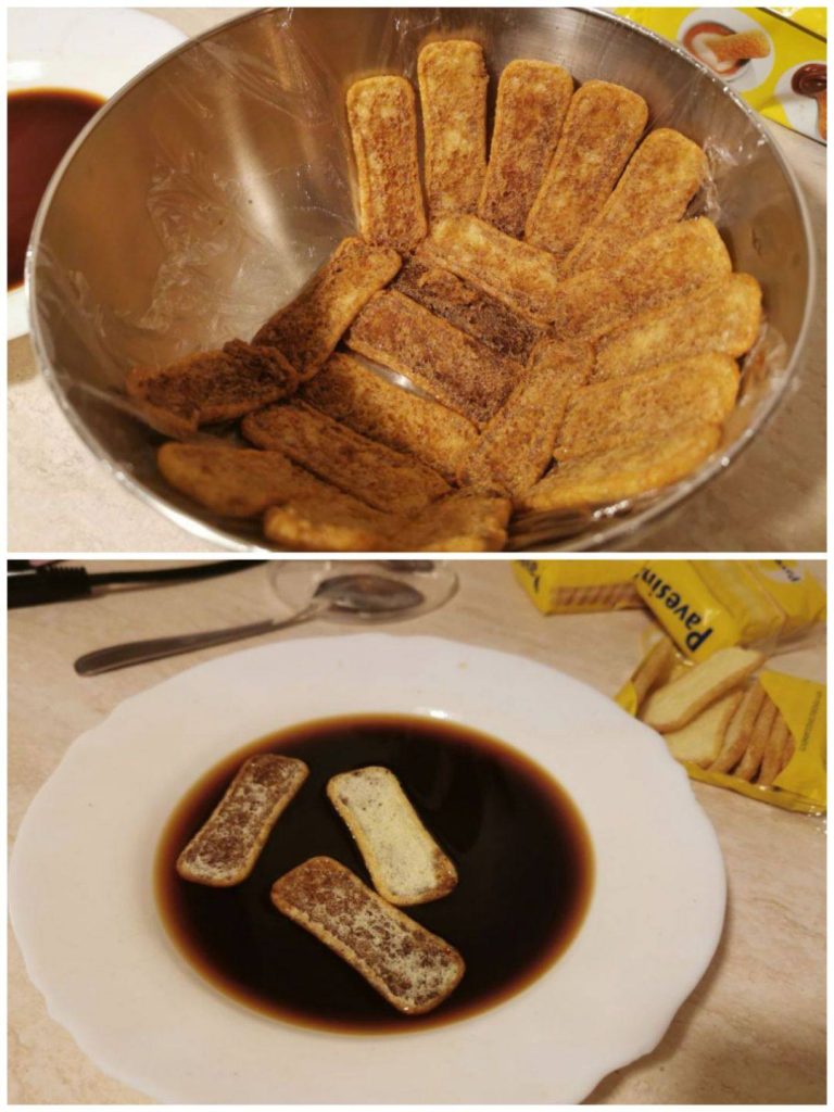 Tapissez un moule à zuccotto ou un bol en aluminium (diamètre 16) avec un film plastique. Trempez les pavesini dans la solution de café et de rhum, quelques-uns à la fois. Ils ne doivent pas être trop imbibés, et commencez à tapisser le bol. Faites d’abord la base, puis le reste du bol