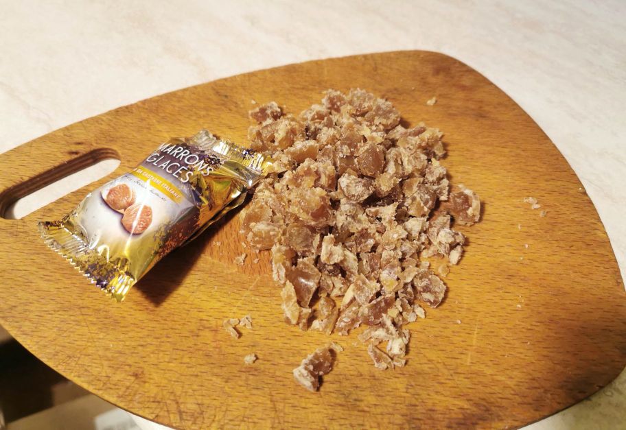 Enfin, hachez assez grossièrement les marrons glacés et ajoutez-les à la crème. Gardez-en environ 3 de côté pour la décoration finale. La crème est prête