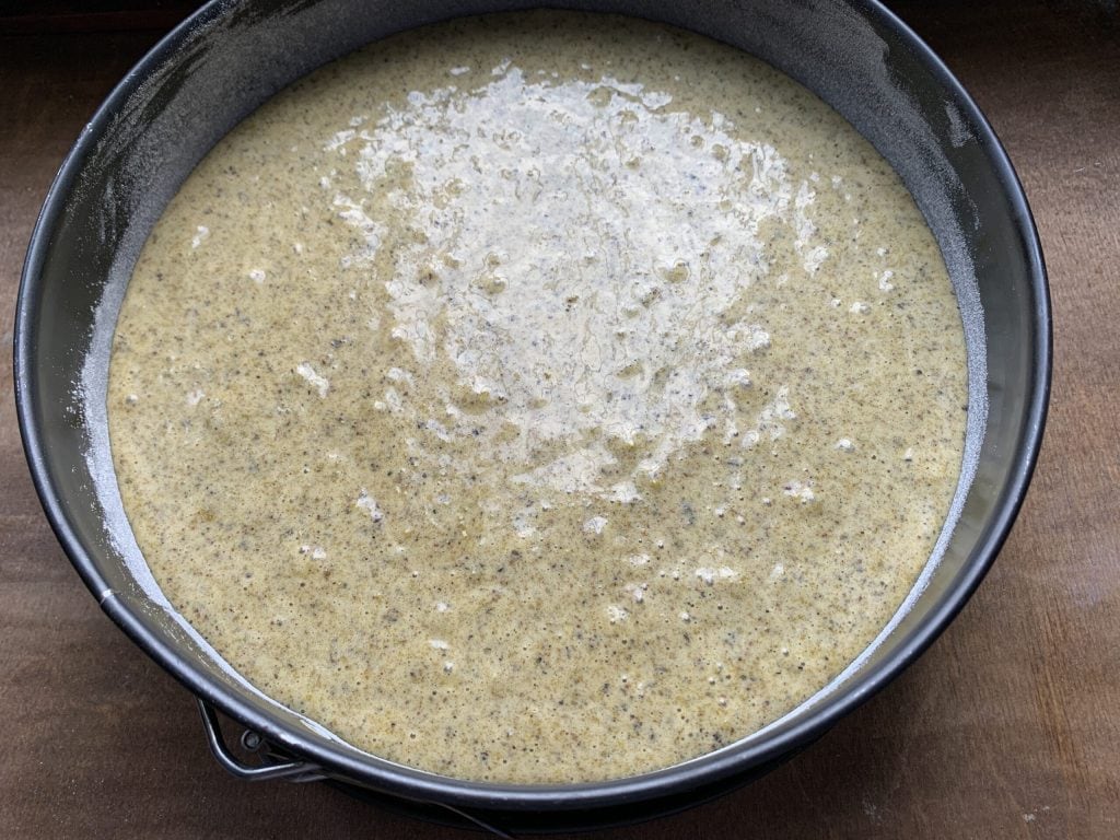 Versez le mélange obtenu dans un moule à charnière de 24 centimètres de diamètre, préalablement beurré à la base et le long de la circonférence, puis mettez un disque de papier sulfurisé à la base et ensuite farinez la circonférence.