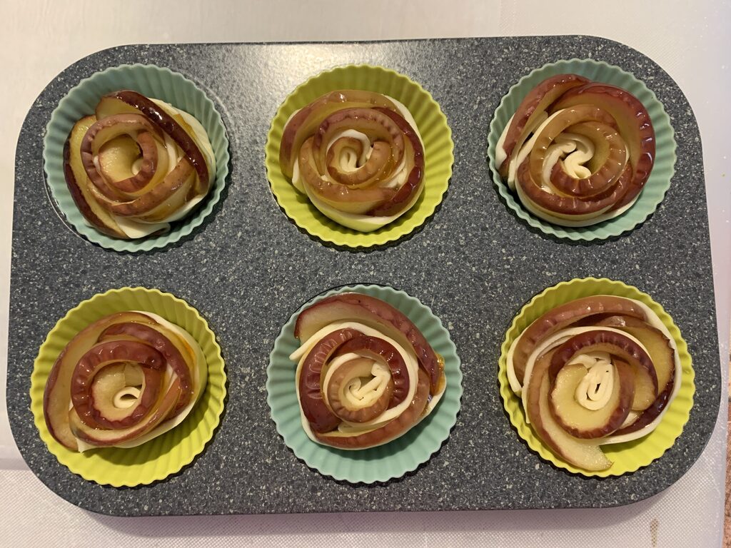 Placez la rose de pâte feuilletée dans une caissette en silicone puis dans un moule à muffins, si vous n’en avez pas, vous pouvez les mettre sur une plaque recouverte de papier sulfurisé.