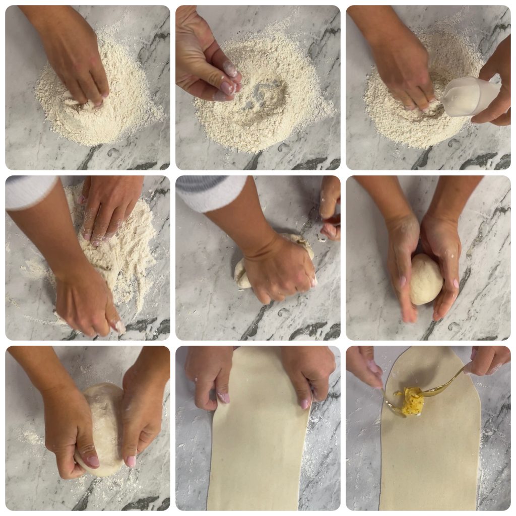 Préparez la pâte : versez la farine en fontaine sur le plan de travail, ajoutez une pincée de sel et l’eau peu à peu. Commencez à pétrir à la main, de plus en plus vigoureusement, pour obtenir une pâte lisse et élastique. Couvrez-la avec un bol et laissez-la reposer une dizaine de minutes.