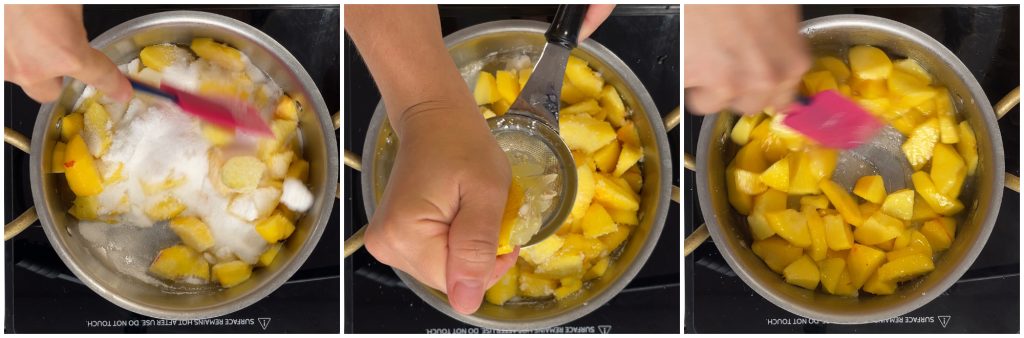 Mettez sur le feu à feu moyen, ajoutez le sucre et le jus de citron. Mélangez et laissez cuire jusqu’à ce que les pêches s’attendrissent et se réduisent en purée.