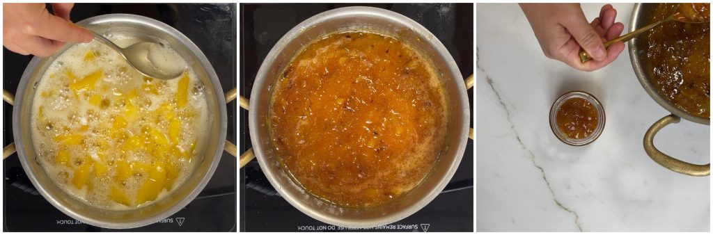 Lorsque le mélange prendra une couleur légèrement ambrée, votre marmelade sera prête. Vous pourrez décider de la mixer ou de la laisser en morceaux. Ayant découpé les fruits en très petits morceaux, ils se sont bien défaits à la cuisson, et il n’a pas été nécessaire, pour moi, de les mixer. Faites selon vos goûts.