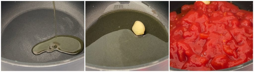 Chauffez un filet d’huile dans une casserole. Ajoutez la gousse d’ail épluchée et légèrement écrasée et, dès que l’ail commence à grésiller, ajoutez la purée ou la pulpe de tomates.