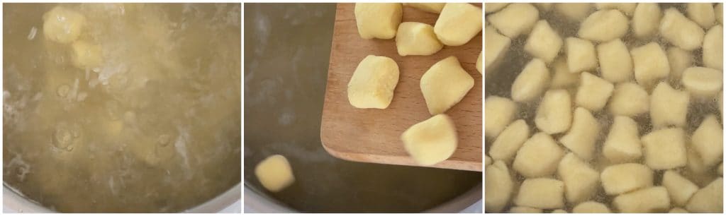 Faites cuire les gnocchi dans une abondante eau salée, et quand ils remontent à la surface, égouttez-les avec une écumoire.