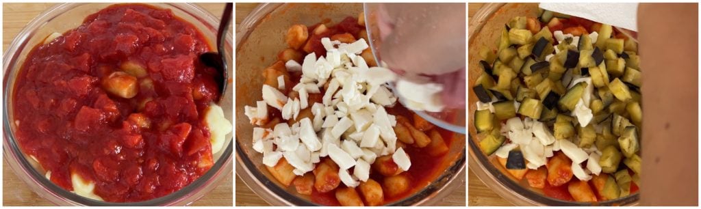 Ajoutez les dés de mozzarella préalablement coupés et séchés avec du papier absorbant, ajoutez également les aubergines frites.