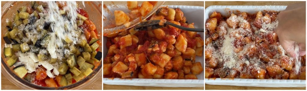 Versez le tout dans un plat à gratin, nivelez, saupoudrez la surface avec le parmesan restant et faites cuire au four statique à 180 degrés pendant environ 20 minutes, le temps nécessaire pour faire gratiner les gnocchi à la parmigiana.