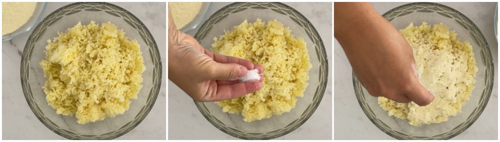 Salez les pommes de terre à votre goût et commencez, petit à petit, à ajouter la semoule.