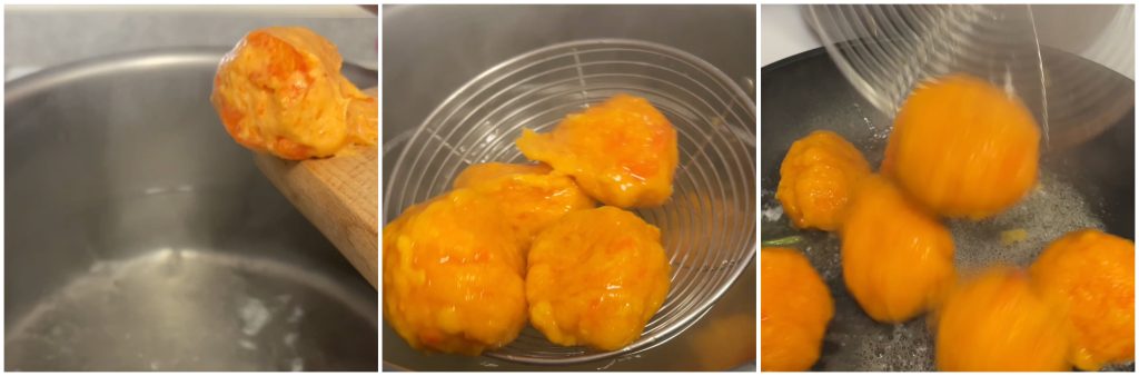 Les gnocchis de carottes farcis ont une consistance de pâte différente des classiques Gnocchis de carottes, comme des Gnocchis de lait et de farine. Ces derniers sont beaucoup plus consistants et on peut facilement leur donner une forme et les strier avec une fourchette ou un outil à gnocchis, tandis que les gnocchis de carottes farcis ressemblent beaucoup aux Gnocchis de brocoli farcis, et vous devrez donc vous mouiller les mains pour former les boulettes qui contiendront le cœur de fromage!
