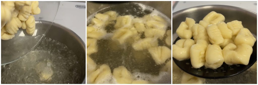 Blanchissez pendant deux minutes les gnocchi de pommes de terre dans de l’eau bouillante salée, puis égouttez-les et rassemblez-les dans un bol.