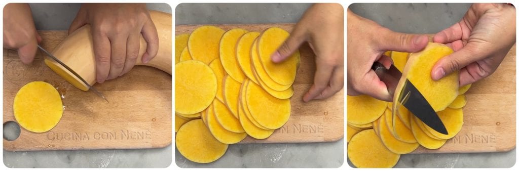 Lavez et nettoyez le potiron, puis tranchez-le très finement et retirez la peau. Comme le potiron ne sera pas précuit, mais cuira au four avec les lasagnes, il est important que les tranches soient très fines. Vous pouvez choisir de les couper avec une mandoline, ou, si vous préférez, vous pouvez les couper en tout petits cubes.