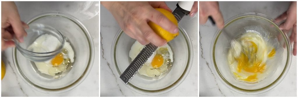 Ajoutez le sucre, le zeste d’un citron, de préférence biologique, et mélangez avec un fouet à main pour amalgamer les ingrédients..