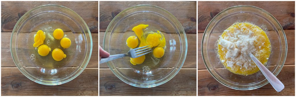 Commencez à les battre avec un fouet ou une fourchette, puis ajoutez le Parmesan râpé, le sel et le poivre.