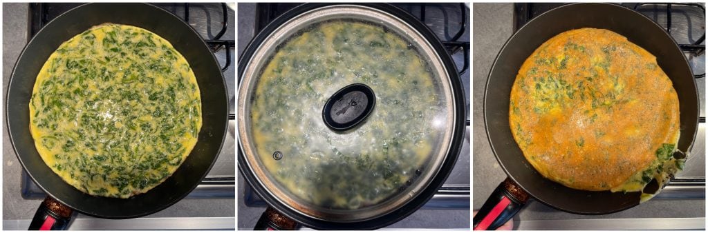 Lorsqu’elle est chaude, versez le mélange à l’intérieur. Baissez le feu et faites cuire l’omelette pendant 10 minutes sur le premier côté, en couvrant avec un couvercle.