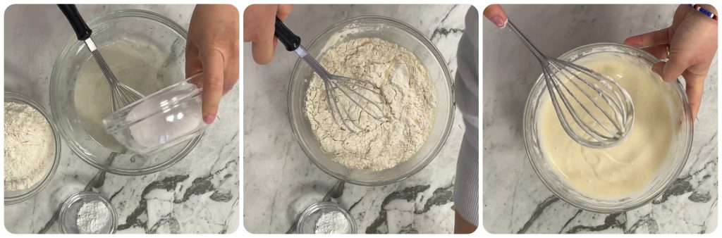 Ajoutez le sucre, la farine et la levure chimique. Mélangez avec un fouet pour obtenir une pâte lisse et homogène.