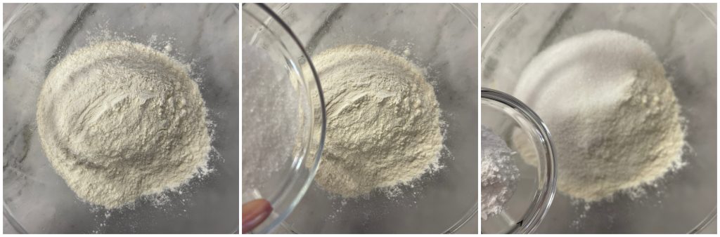 Dans un bol, versez la farine avec le sucre et la levure chimique pour pâtisserie.