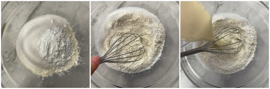 Mélangez les ingrédients secs puis commencez à ajouter le lait de soja en filet, en mélangeant avec le fouet pour obtenir une pâte lisse et homogène sans grumeaux.
