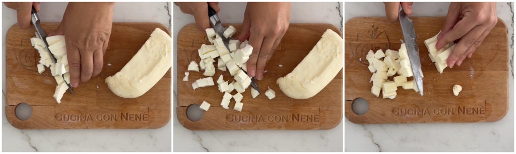 Coupez la mozzarella fiordilatte et la caciotta en petits cubes.