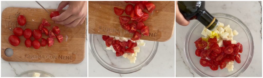 Coupez également les tomates cerises en quartiers et rassemblez les fromages et les tomates dans un grand bol.