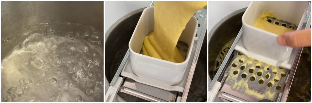 • Faites chauffer beaucoup d’eau dans une casserole. Lorsqu’elle bout, salez-la à votre goût, placez la râpe dessus et versez la pâte à l’intérieur.