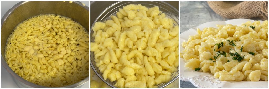 • Laissez cuire les spätzle pendant quelques minutes, quand ils seront prêts, égouttez-les et mettez-les dans une poêle avec le beurre fondu. Faites sauter, ajoutez un peu de ciboulette et servez chaud à table.