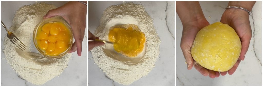 Versez les jaunes d’œufs au centre de la farine. Puis, avec une fourchette, commencez à battre les jaunes et petit à petit commencez à incorporer la farine environnante.