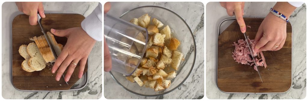 Coupez le pain rassis en cubes et mettez-le dans un bol.