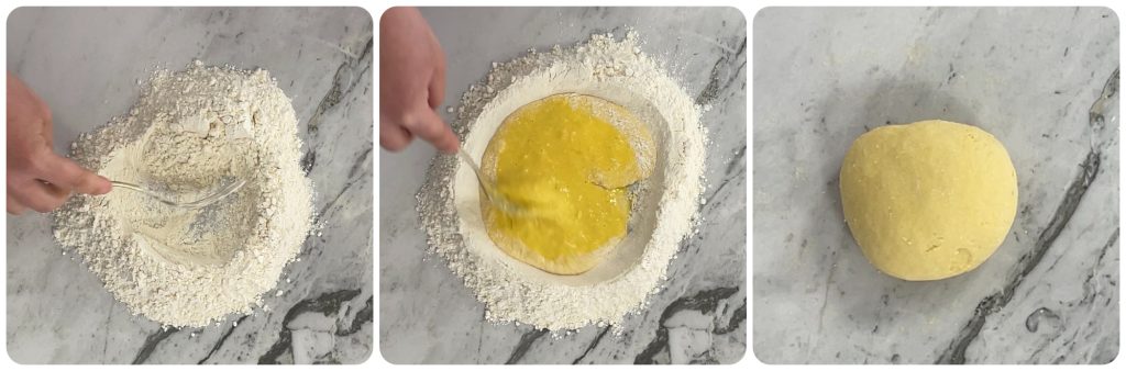 Commencez à intégrer, petit à petit, la farine. Puis pétrissez à la main jusqu’à obtenir une pâte lisse et homogène.