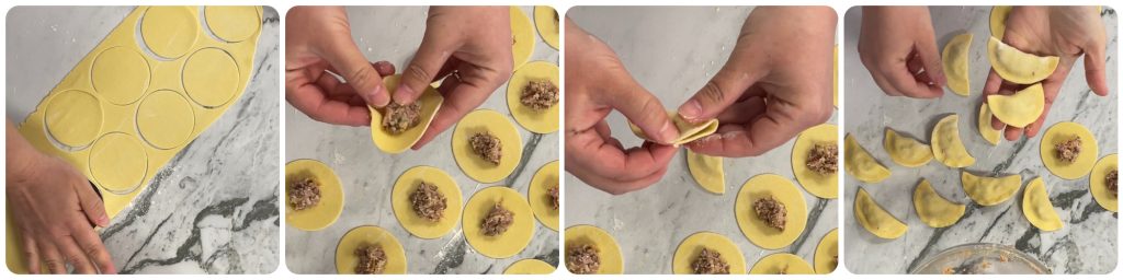 Placez un peu de farce au centre de chaque cercle, puis repliez en deux pour créer une demi-lune.