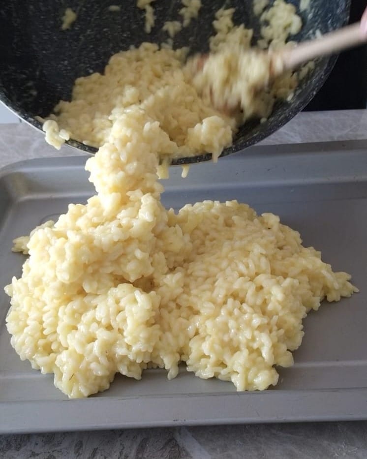 Après le temps de refroidissement, divisez le riz en environ 12 portions, prenez-en une, aplatissez-la légèrement avec les mains légèrement mouillées d’eau, lui donnant la forme d’une arancina et remplissez le centre avec le fromage.