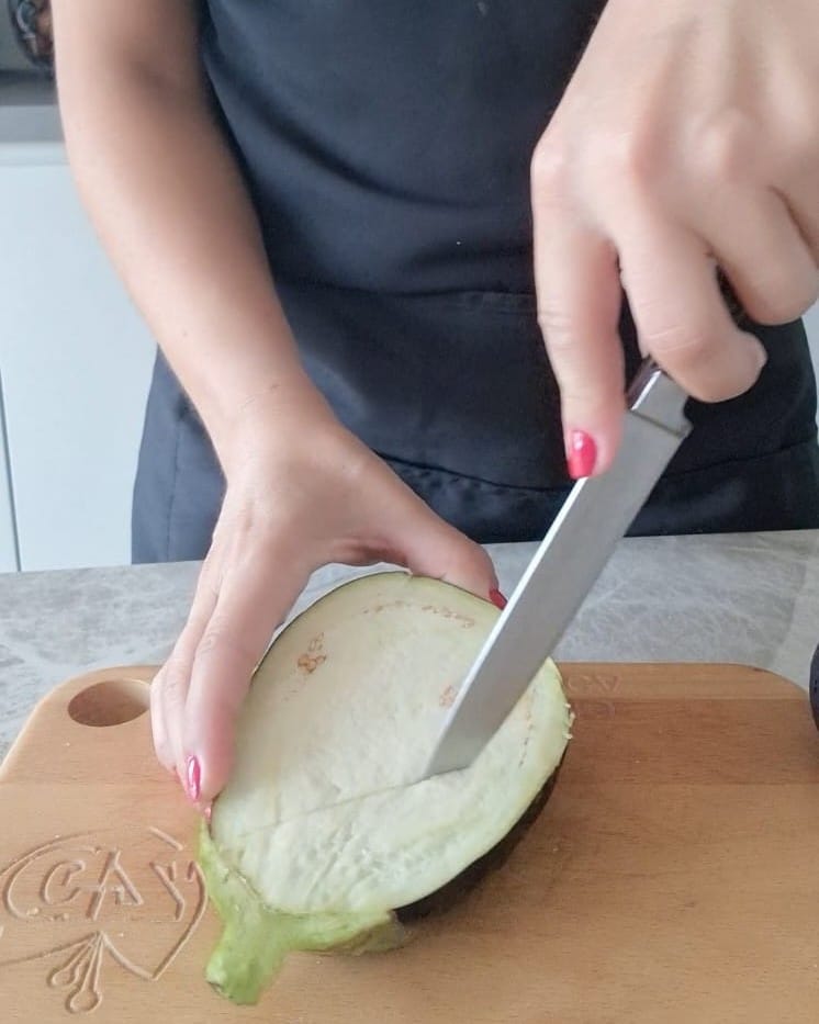 Lavez très bien les aubergines, puis divisez-les en deux et incisez la pulpe à l’intérieur avec des entailles transversales suffisamment profondes.